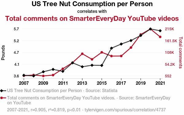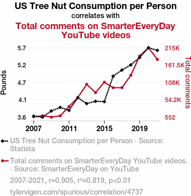 - The spurious research paper: Can Tree Nuts on the Go Trigger SmarterYouTube Flow?: Exploring the Relationship Between US Tree Nut Consumption and Total Comments on SmarterEveryDay Videos