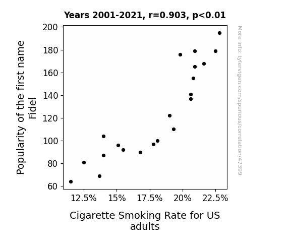 This means 81.5% of the change in the one variable (i.e., Cigarette Smoking Rate for US adults) is predictable based on the change in the other (i.e., Popularity of the first name Fidel) over the 21 years from 2001 through 2021.