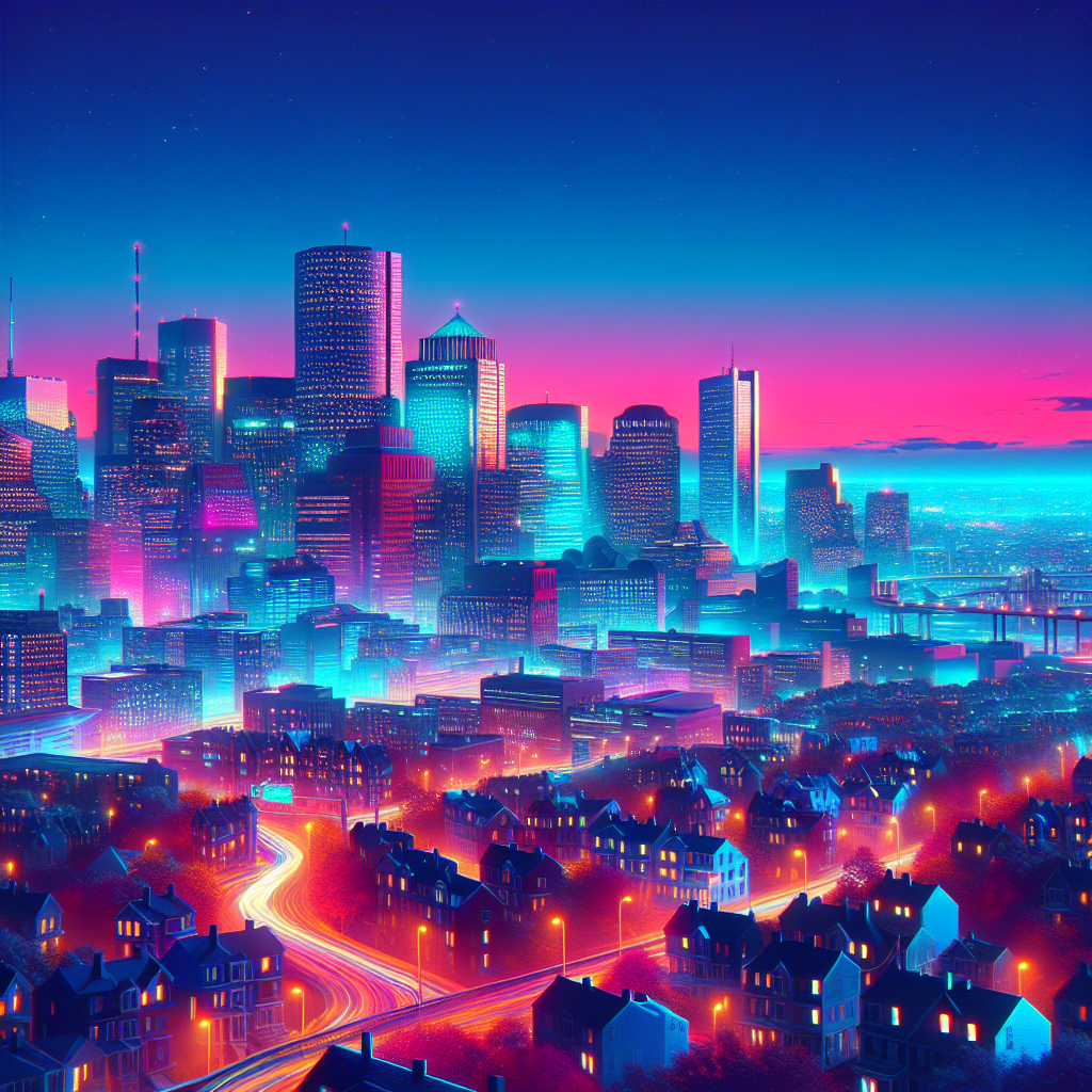 ChatGPT: Generate an image that captures the essence of a vibrant Boston cityscape at night, enveloped in a Vaporwave aesthetic. The image should emanate a sense of futuristic serenity as the bright city lights illuminate the streets of Boston amid a crisp, clear night sky. The reduced smog and enhanced visibility contribute to the ambiance, showcasing a cleaner and more environmentally conscious urban environment. The city should appear positively transformed, with fewer kerosene lamps illuminating homes and a noticeable decrease in street noise. The overall scene should exude a feeling of progress and tranquility in a retro-futuristic style.