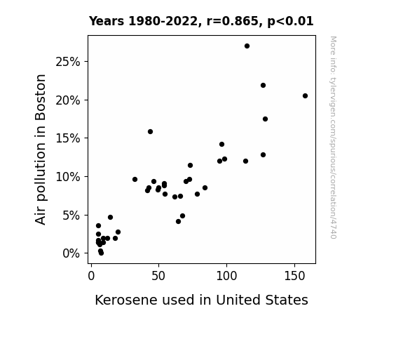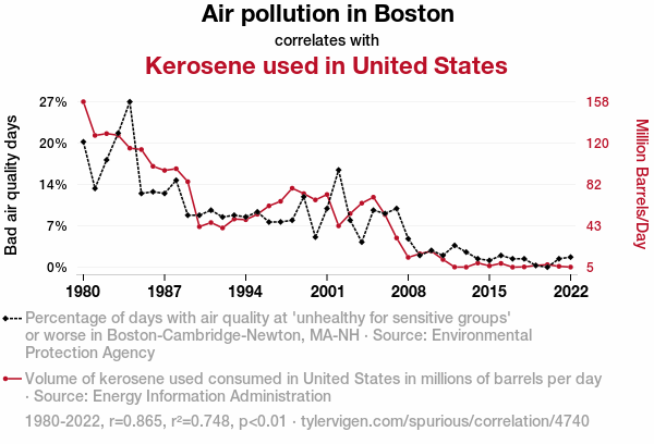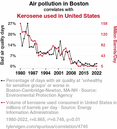 This means 74.8% of the change in the one variable (i.e., Kerosene used in United States) is predictable based on the change in the other (i.e., Air pollution in Boston) over the 43 years from 1980 through 2022.
