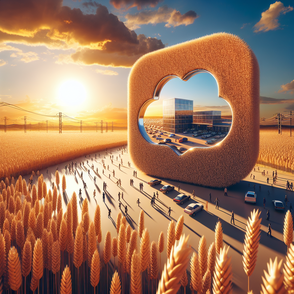 Prompt: [Concept art] Create an image of a vast Kansas wheat field under a golden sunset, with the warm sunlight casting long shadows on the gently swaying wheat. In the foreground, there is a larger-than-life YouTube logo, polished and glimmering in the sunlight, with a subtle reflection of the wheat field in its surface. As the viewer's gaze shifts to the right, a bustling actuarial office emerges from the wheat, complete with a large, modern building and a parking lot filled with cars. Silhouetted figures can be seen streaming into the office, and with each passing moment, the number of professionals flooding in steadily increases, evoking a sense of growth and opportunity. The visual relationship between the burgeoning YouTube views and the expanding cohort of actuaries is evident and impactful. The depiction should include only scenes, people, and objects, it should not include text or speech bubbles.