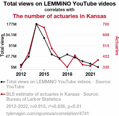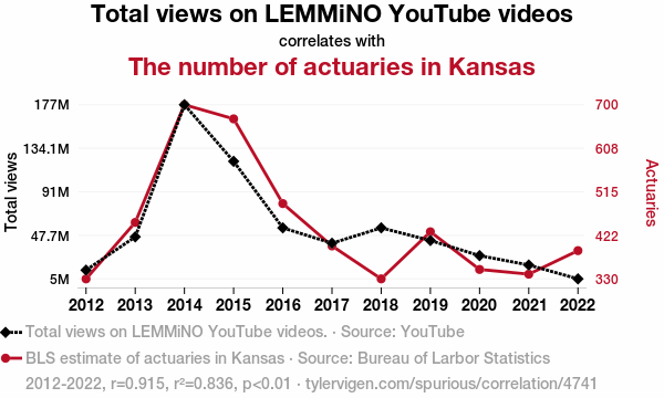 - The spurious research paper: Actuarial Attractions: Exploring the Correlation Between LEMMiNO YouTube Video Views and the Number of Number Crunchers in Kansas