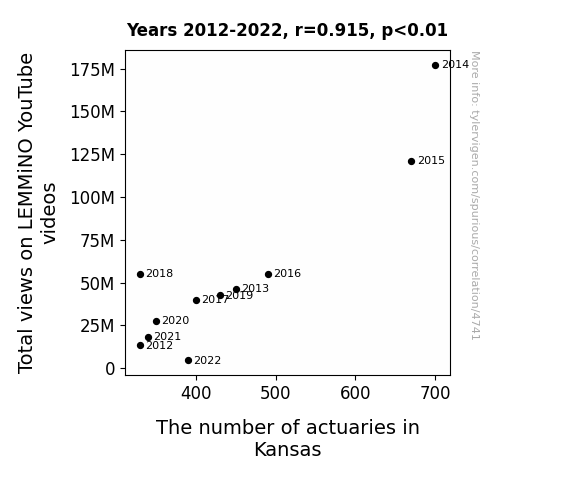 To investigate the mystical magnetism of LEMMiNO's YouTube content on the actuarial workforce of Kansas, our research team embarked on a data-gathering adventure spanning the digital realm and the bureaucratic labyrinth of labor statistics. With a concoction of precision and whimsy, we wrangled datasets from 2012 to 2022, harnessed from the all-knowing archives of YouTube and the infallible repository of the Bureau of Labor Statistics. Our data collection caper involved extracting the total views of all LEMMiNO videos and the number of actuaries gainfully employed in the sprawling plains of Kansas.