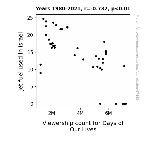 This means 53.5% of the change in the one variable (i.e., Viewership count for Days of Our Lives) is predictable based on the change in the other (i.e., Jet fuel used in Israel) over the 42 years from 1980 through 2021.