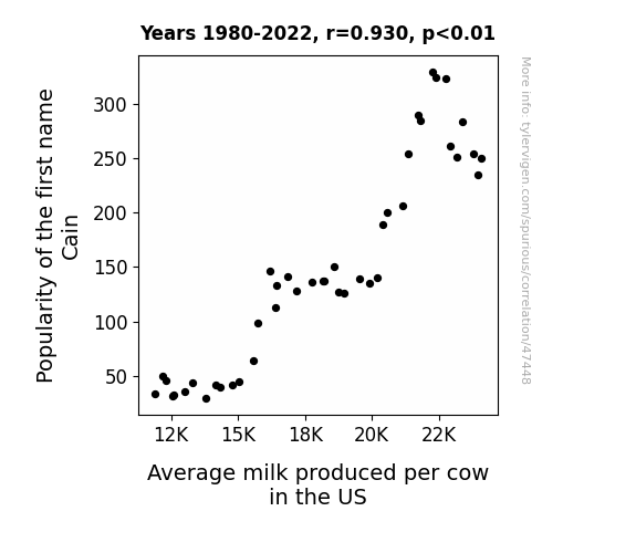 This means 86.4% of the change in the one variable (i.e., Average milk produced per cow in the US) is predictable based on the change in the other (i.e., Popularity of the first name Cain) over the 43 years from 1980 through 2022.