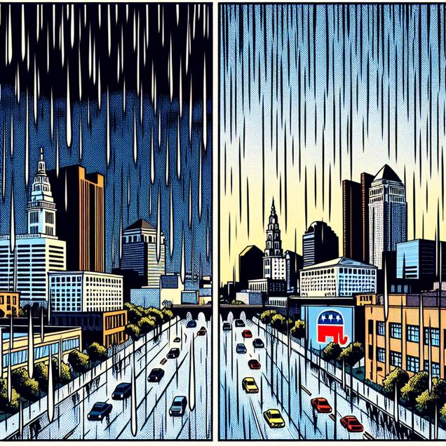 ChatGPT: Generate a comic-book-style illustration set in Columbus, Ohio, during a heavy rainstorm. In the scene, depict the cityscape with muted colors and a dotted halftone pattern reminiscent of 1960s comic books. Show the darkened sky pouring heavy rain, washing away democratic symbols, while the Republican presidential candidate's votes remain unscathed, standing high and dry amidst the deluge. Keep the visuals simple and focused on capturing the contrasting impact of the rain on the election results.