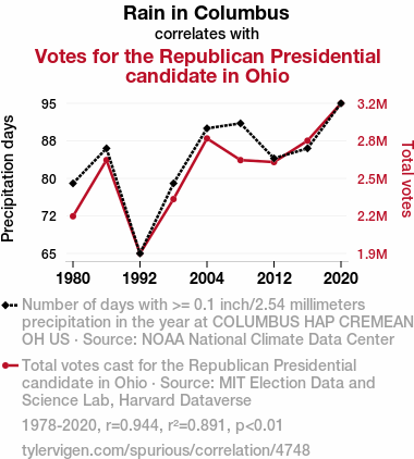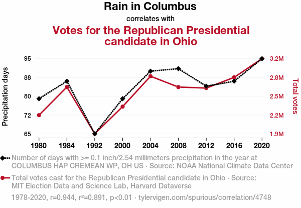 - The spurious research paper: Rain or Shine: A Political Downpour - The Precipitation-Presidential Candidate Relationship in Ohio