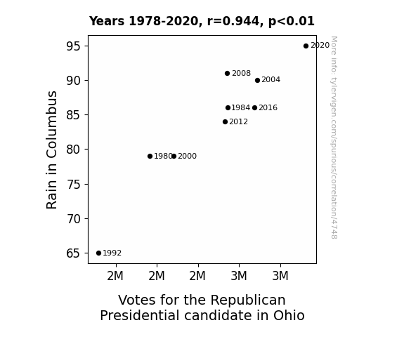 Our research team observed a strikingly high correlation coefficient of 0.9440926 and a statistically significant p-value of less than 0.01 for the years spanning from 1978 to 2020. This compelling statistical evidence offers a compelling argument for the influence of rain on the voting behavior in Ohio. Certainly, precipitation seems to wield a considerable impact on the political landscape, making it rain votes for the Republican candidate in unexpected ways.