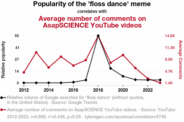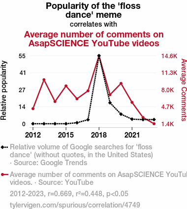 This means 44.8% of the change in the one variable (i.e., Average number of comments on AsapSCIENCE YouTube videos) is predictable based on the change in the other (i.e., Popularity of the 'floss dance' meme) over the 12 years from 2012 through 2023.