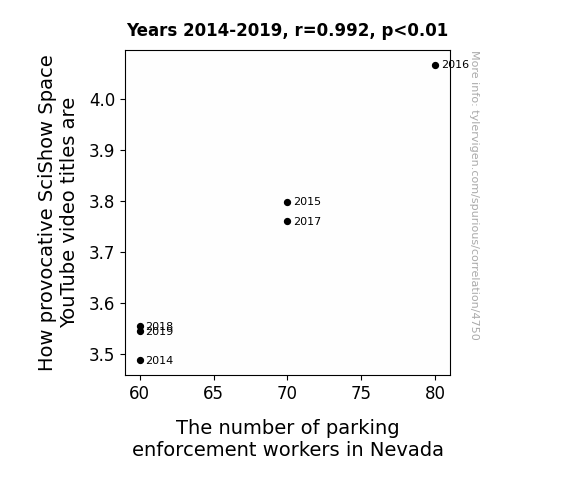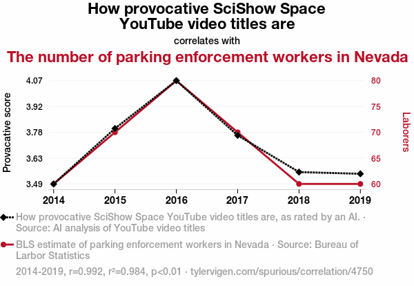 This means 98.4% of the change in the one variable (i.e., The number of parking enforcement workers in Nevada) is predictable based on the change in the other (i.e., How provocative SciShow Space YouTube video titles are) over the 6 years from 2014 through 2019.