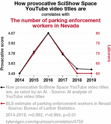 User prompt: Please make up a funny explanation for how increases in How provocative SciShow Space YouTube video titles are positively influenced The number of parking enforcement workers in Nevada.
