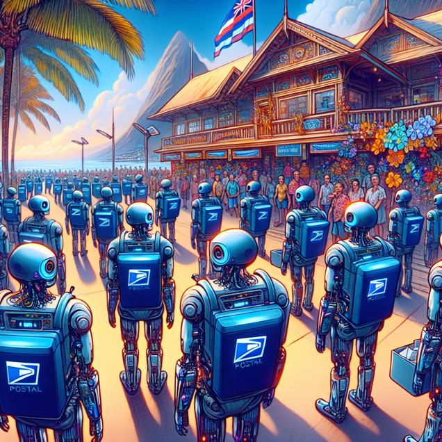 User prompt: Please describe a visual scene that prominently depicts both How provocative Technology Connections YouTube video titles are and The number of postmasters in Hawaii, in the following situation: As the number of postmasters in Hawaii decreases, there are fewer people to educate the AI postal robots, causing a literal breakdown in communication. This leads to a shortage of clickbait inspiration, resulting in less provocative Technology Connections YouTube video titles. Remember, when it comes to technology and postmasters, it's all about making those electric connections!. Keep the description simple.