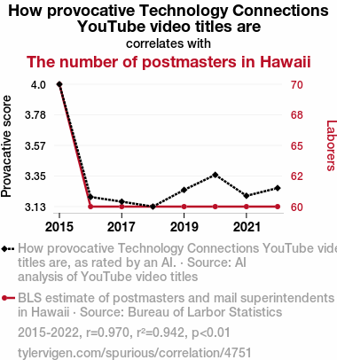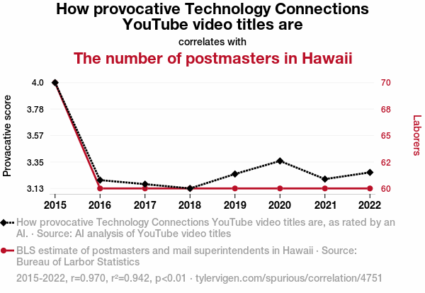 This means 94.2% of the change in the one variable (i.e., The number of postmasters in Hawaii) is predictable based on the change in the other (i.e., How provocative Technology Connections YouTube video titles are) over the 8 years from 2015 through 2022.