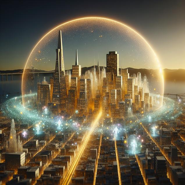 ChatGPT: Generate an image of a sleek, futuristic San Francisco skyline depicted as a beautiful coronal mass of golden light, with shimmering air particles giving off a bright, glowing aura. Within the skyline, tiny microscopic activists resembling luminescent, ethereal beings are seen dispersing into the city, along with air particles carrying miniature signs with the message "Cleaner Skies Now!" in a visually compelling and serene depiction.
