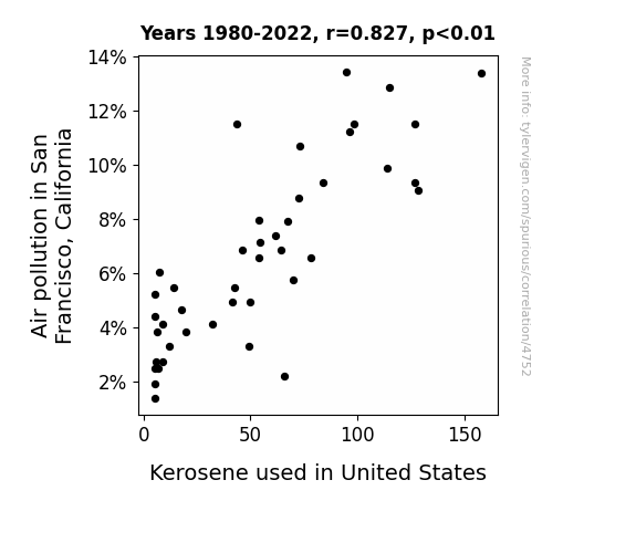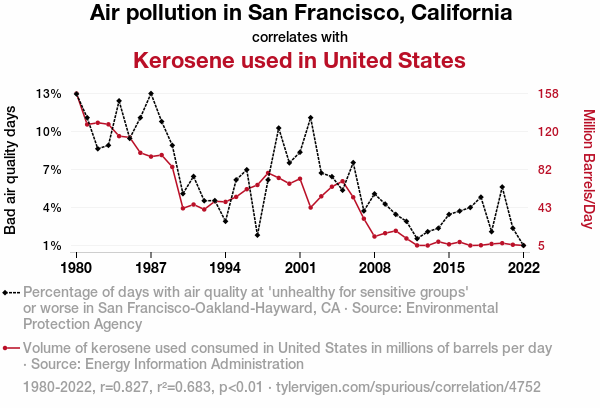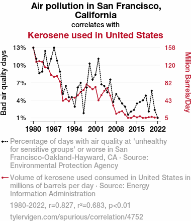 - The spurious research paper: Up in the Air: A Fumes-y Connection Between Air Pollution in San Francisco and Kerosene Consumption in the United States