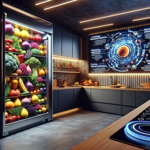 Prompt: Prompt: Create an image that portrays a moment in a modern kitchen where a sleek, high-tech refrigerator is filled with a delightful array of vivid fruits and vegetables. A state-of-the-art cooktop shines under warm overhead lighting. In the scene, a nearby screen displays a Deep Look YouTube video with a lengthy duration indicator, featuring captivating visuals and detailed explanations on a scientific topic. The overall vibe should evoke a sense of modernity and intellectual curiosity. The depiction should include only scenes, people, and objects, it should not include text or speech bubbles.