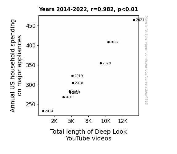 With bated breath, we can now reveal our findings, which left us as startled as a toaster with an inexplicable knack for reciting Shakespeare. Our analysis, spanning the years 2014 to 2022, unveiled a correlation coefficient of 0.9818927 and p < 0.01, suggesting a strikingly robust relationship between annual US household spending on major appliances and the total length of Deep Look videos. Yes, the connection was as clear as the crystal-clean glass of a brand-new dishwasher - and we were just as puzzled as a malfunctioning microwave at midnight!