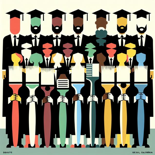 Prompt: Prompt: [ inspired by bauhaus ] Visualize a scene in Ukiah, California where dental assistants proudly stand outside in the fresh air, each holding oversized toothbrushes and wearing their graduation caps and gowns. As they gently scrub the air, it seems to become clearer and fresher, leaving the city with a much-needed breath of fresh air. The depiction should include only scenes, people, and objects, it should not include text or speech bubbles.
