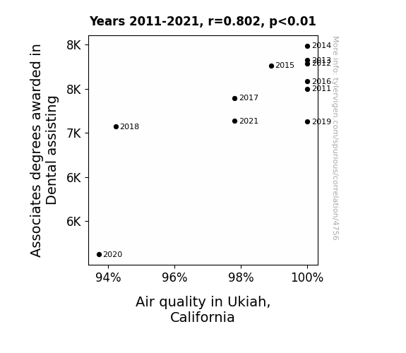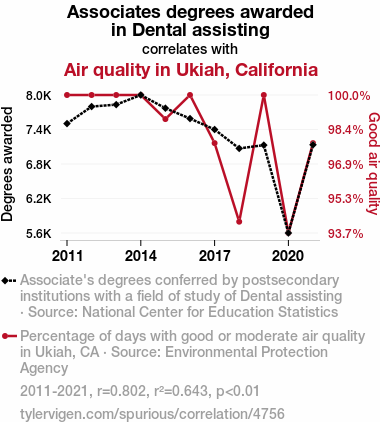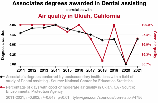 "Dental Assisting Associate Degrees," "air quality in Ukiah, California," "National Center for Education Statistics," "Environmental Protection Agency data," "correlation coefficient," "associates degree statistics," "air quality analysis," "Ukiah air quality," "education and air quality correlation," "dental professionals impact on air quality."