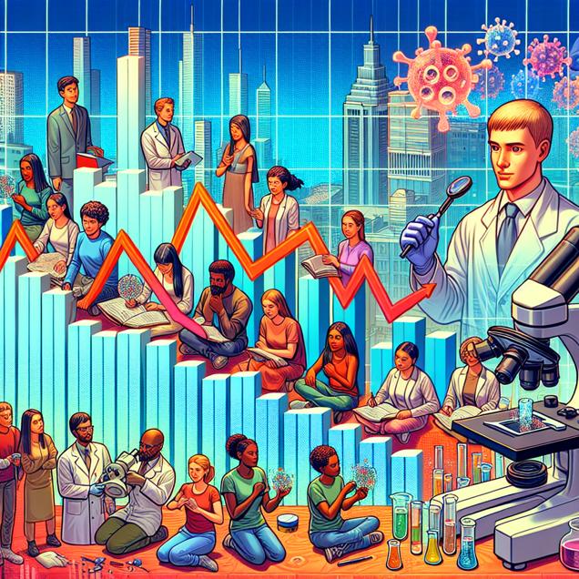 Prompt: Prompt: Generate an image inspired by the scene with the following style - a humorous meme-style image you would see on Reddit. Description: Visualize a bustling cityscape with the YouTube Analytics graph prominently displayed, showing the Average views of LEMMiNO's videos steadily rising. Nearby, depict a group of individuals engrossed in examining various materials under a microscope with palpable focus and enthusiasm. The scene should capture their meticulous study of substances, reflecting the inquisitive nature of the captivating content. The two scenes should seamlessly depict the interplay between the increasing Average views of LEMMiNO's YouTube videos and the growing number of materials engineers in Missouri, as the captivating content inspires a newfound interest in the world of materials engineering. Clarification: The depiction should be simple and not include any words or speech bubbles. Embellish the cityscape with lively and diverse characters to infuse the image with a humorous and relatable quality reminiscent of a meme-style post on Reddit. The depiction should include only scenes, people, and objects, it should not include text or speech bubbles.