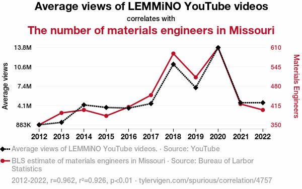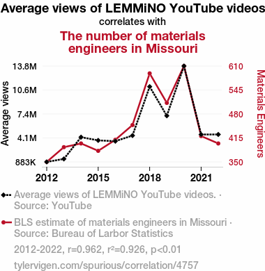 This means 92.6% of the change in the one variable (i.e., The number of materials engineers in Missouri) is predictable based on the change in the other (i.e., Average views of LEMMiNO YouTube videos) over the 11 years from 2012 through 2022.
