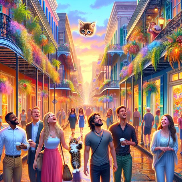 ChatGPT: Generate an image of a group of people strolling down the vibrant streets of New Orleans, surrounded by blooming flowers and clear, crisp air. In the scene, a tiny, fluffy kitten is perched on a windowsill, capturing the attention of the passersby who excitedly exclaim, "Oh, it's so smol!" The atmosphere is filled with joy and affection as the happiness from the clean air seeps into every interaction, making even the smallest of things seem especially adorable. Capture the warmth and delight in the onlookers' eyes as they admire the adorable kitten.