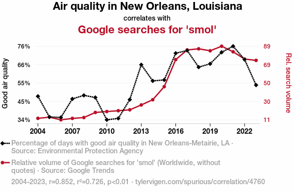 "air quality New Orleans Louisiana", "Google searches smol", "EPA air quality data", "Google Trends analysis", "correlation coefficient atmospheric conditions internet search", "unexpected connections air quality internet search behavior", "humor in atmospheric conditions", "quirky correlations air quality Google searches"