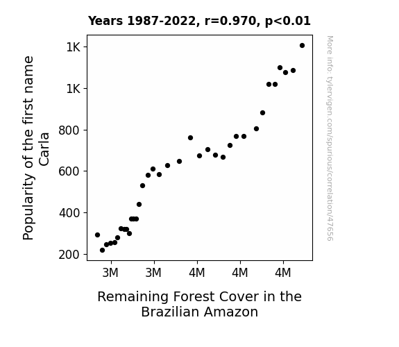 This means 94.1% of the change in the one variable (i.e., Remaining Forest Cover in the Brazilian Amazon) is predictable based on the change in the other (i.e., Popularity of the first name Carla) over the 36 years from 1987 through 2022.