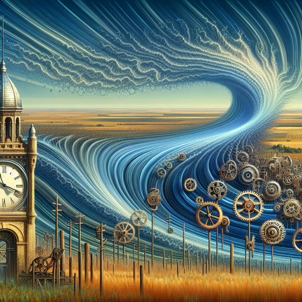Prompt: Generating prompt... "Create an image of an elaborate clock tower standing in the center of a vast Nebraska landscape. The clock's hands are moving backwards, symbolizing the reversal of time. Surrounding the clock tower are diminishing gears, each one becoming less defined and precise. As the gears decay, a ripple effect spreads through the state, with machinery grinding to a halt in the distance. The once vibrant landscape now reflects the fading precision and coolness factor, mirroring the decline of Nebraska's machinery industry." The depiction should include only scenes, people, and objects, it should not include text or speech bubbles.