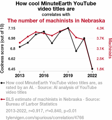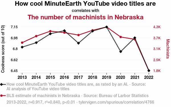A linear line chart with years as the X-axis and two variables on the Y-axis. The first variable is How cool MinuteEarth YouTube video titles are and the second variable is The number of machinists in Nebraska.  The chart goes from 2013 to 2022, and the two variables track closely in value over that time. Small Image