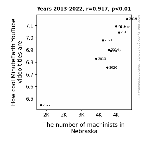 This means 84% of the change in the one variable (i.e., The number of machinists in Nebraska) is predictable based on the change in the other (i.e., How cool MinuteEarth YouTube video titles are) over the 10 years from 2013 through 2022.