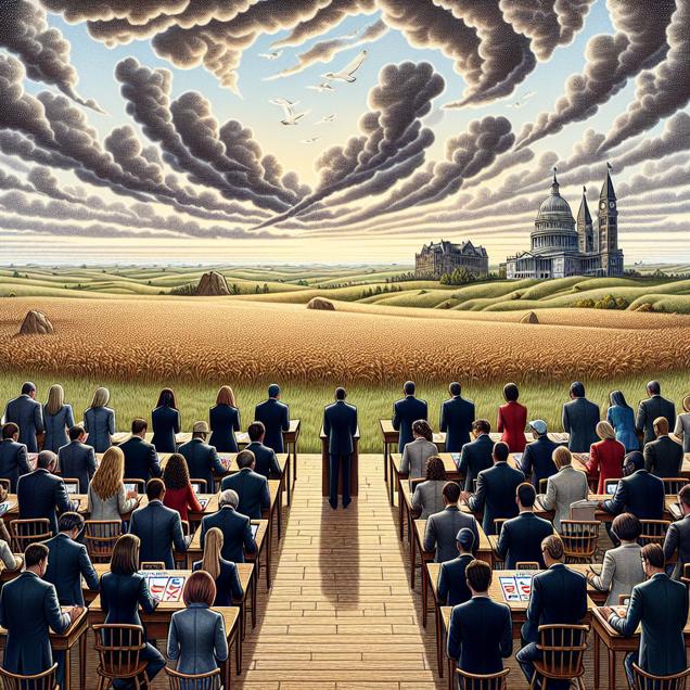 Prompt: Generate an image of a vast, rolling prairie landscape under a sky filled with dramatic clouds. In the foreground, visualize a group of young, determined individuals in professional attire casting their votes, with each ballot appearing to materialize a new lawyer. The scene should convey the fusion of political fervor and legal aspiration, with a sense of momentum and transformation. The depiction should include only scenes, people, and objects, it should not include text or speech bubbles.