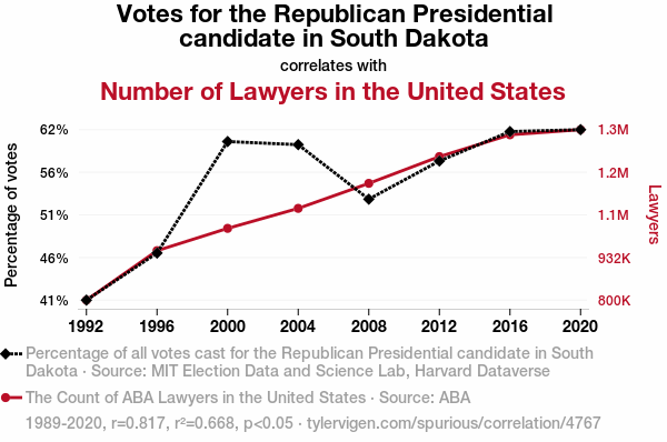 User prompt: Please make up a funny explanation for how an increase in Votes for the Republican Presidential candidate in South Dakota caused Number of Lawyers in the United States to increase.