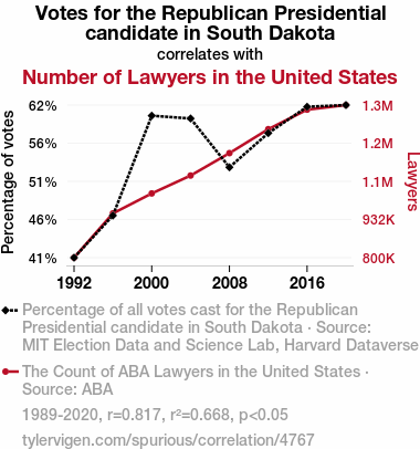 This means 66.8% of the change in the one variable (i.e., Number of Lawyers in the United States) is predictable based on the change in the other (i.e., Votes for the Republican Presidential candidate in South Dakota) over the 8 years from 1989 through 2020.