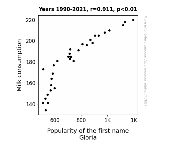 This means 83% of the change in the one variable (i.e., Popularity of the first name Gloria) is predictable based on the change in the other (i.e., Milk consumption) over the 32 years from 1990 through 2021.