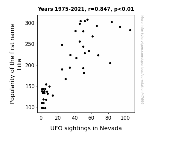 This means 71.7% of the change in the one variable (i.e., UFO sightings in Nevada) is predictable based on the change in the other (i.e., Popularity of the first name Lilia) over the 47 years from 1975 through 2021.