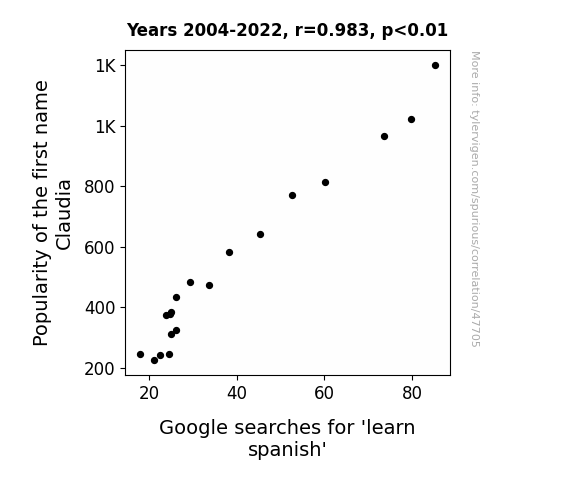 This means 96.7% of the change in the one variable (i.e., Google searches for 'learn spanish') is predictable based on the change in the other (i.e., Popularity of the first name Claudia) over the 19 years from 2004 through 2022.