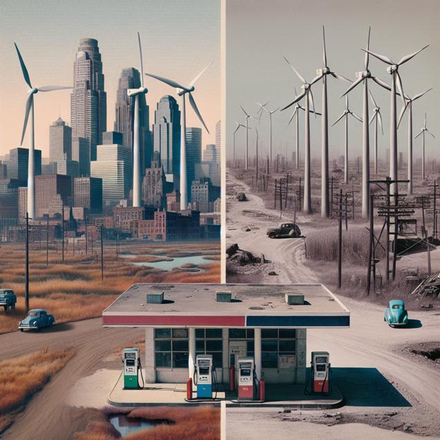 ChatGPT: Generate an image of two stark landscapes, one featuring the Minneapolis wind turbines against a Brutalist urban backdrop, and the other showcasing the quiet gas station in Cuba. The Minneapolis scene should convey a sense of industrial grandeur with imposing structures and the motionless wind turbines, while the Cuban scene should emphasize the eerie emptiness of the gas station with a Brutalist architectural style. Both scenes should capture the contrasting stillness and convey the unifying theme of decreased activity.