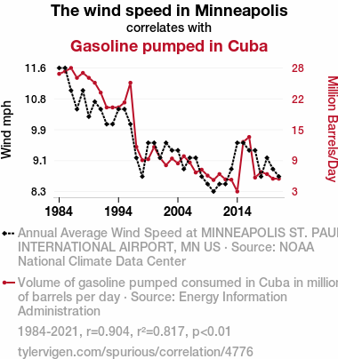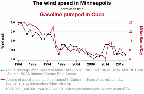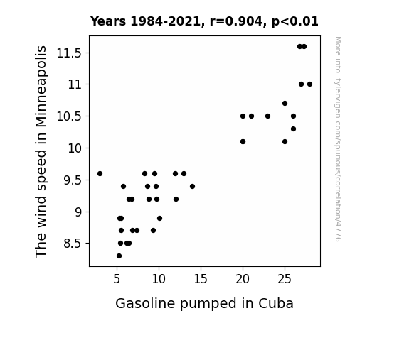 This means 81.7% of the change in the one variable (i.e., Gasoline pumped in Cuba) is predictable based on the change in the other (i.e., The wind speed in Minneapolis) over the 38 years from 1984 through 2021.