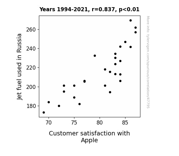 This means 70.1% of the change in the one variable (i.e., Customer satisfaction with Apple) is predictable based on the change in the other (i.e., Jet fuel used in Russia) over the 28 years from 1994 through 2021.