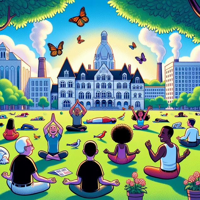 Prompt: [ Whimsical illustration ] Generate an image of Syracuse, New York, with a joyful atmosphere. In this scene, show a group of diverse people practicing yoga and meditation in a park, with vibrant greenery and clear skies. The air is visibly fresh and clean, with birds and butterflies fluttering around. The individuals should exude a sense of relaxation and contentment, reflecting the harmony between the popularity of the name Saige for newborns and the improved air quality from the community's collective efforts. The depiction should include only scenes, people, and objects, it should not include text or speech bubbles.