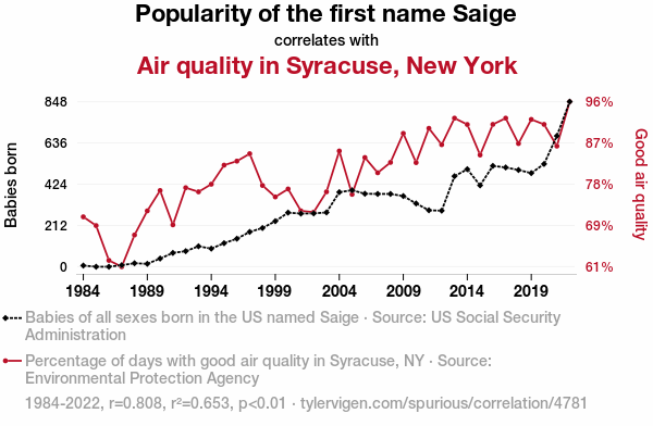 This means 65.3% of the change in the one variable (i.e., Air quality in Syracuse, New York) is predictable based on the change in the other (i.e., Popularity of the first name Saige) over the 39 years from 1984 through 2022.
