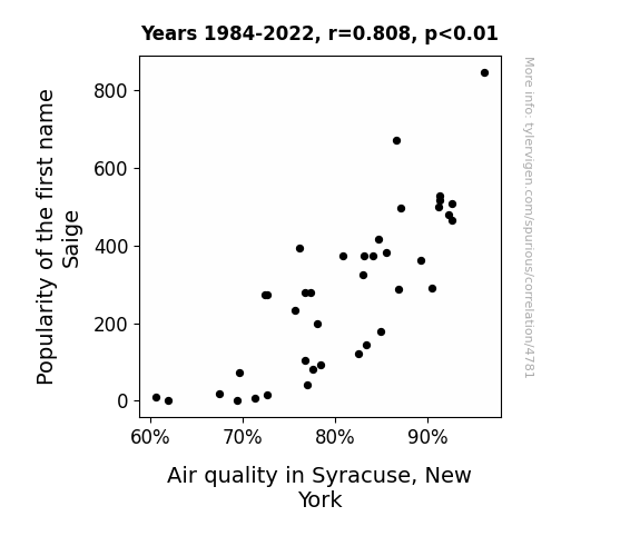 User prompt: Please provide potential search keywords for a paper titled Saige and Syracuse: A Study on Airy Popularity and Air Quality Purity with an abstract of In this wacky and wonderful academic research paper, we dive into the unexpected connection between the popularity of the first name Saige and the air quality in Syracuse, New York. The data analysis, though initially a bit breezy, revealed a surprisingly high correlation coefficient of 0.8082130 and p < 0.01 for the period spanning 1984 to 2022. Utilizing information from the US Social Security Administration and the Environmental Protection Agency, our research team set out to tackle this charmingly peculiar question. We uncover the quirky link between the airy popularity of the name Saige and the purity of air quality in Syracuse, proving that sometimes the answers can be found right under our noses, or rather, in the name game of statistics and air supply!