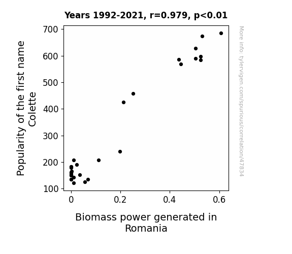 This means 95.8% of the change in the one variable (i.e., Biomass power generated in Romania) is predictable based on the change in the other (i.e., Popularity of the first name Colette) over the 30 years from 1992 through 2021.
