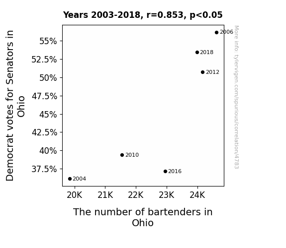 Our investigation into the relationship between Democrat votes for Senators in Ohio and the employment of bartenders across the state has yielded intriguing findings. Over the period 2003 to 2018, we observed a statistically significant correlation coefficient of 0.8527399 and an r-squared value of 0.7271653. The p-value of less than 0.05 further emphasizes the robustness of the correlation.
