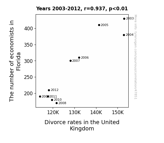 This means 87.9% of the change in the one variable (i.e., Divorce rates in the United Kingdom) is predictable based on the change in the other (i.e., The number of economists in Florida) over the 10 years from 2003 through 2012.