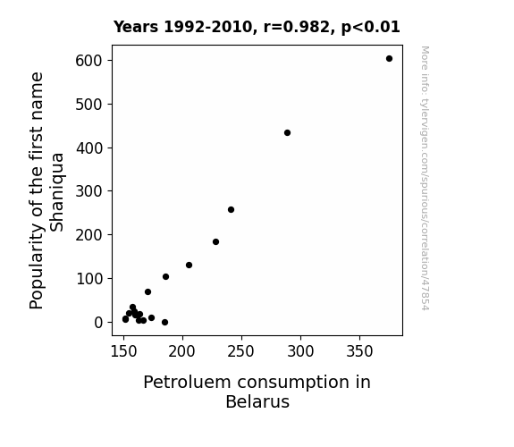 This means 96.5% of the change in the one variable (i.e., Petroluem consumption in Belarus) is predictable based on the change in the other (i.e., Popularity of the first name Shaniqua) over the 19 years from 1992 through 2010.