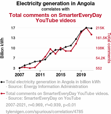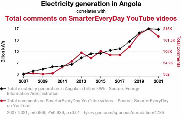 This means 93.9% of the change in the one variable (i.e., Total comments on SmarterEveryDay YouTube videos) is predictable based on the change in the other (i.e., Electricity generation in Angola) over the 15 years from 2007 through 2021.