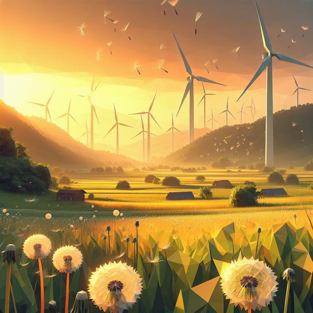 ChatGPT: Generate an image of a serene countryside merging elements from Clarksville, Tennessee and Venezuela. Imagine a landscape bathed in a golden, hazy light, with low poly representations of rolling hills and meadows. In the foreground, dandelion seeds and pollen drift gently in the air. In the background, low poly wind turbines spin vigorously against a sunset-lit sky, suggesting the sudden gust of wind that propels them to generate extra power.