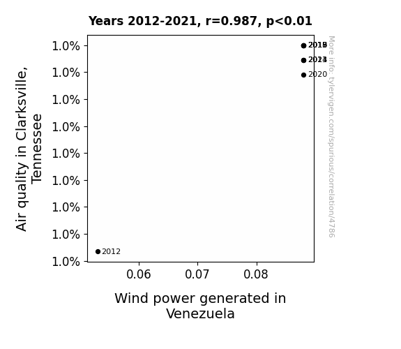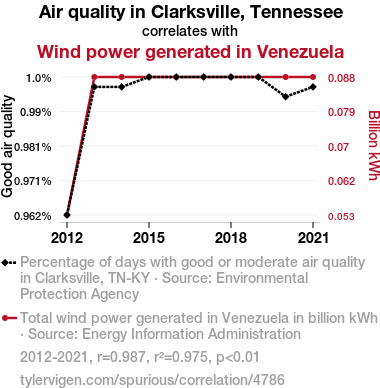 This means 97.5% of the change in the one variable (i.e., Wind power generated in Venezuela) is predictable based on the change in the other (i.e., Air quality in Clarksville, Tennessee) over the 10 years from 2012 through 2021.